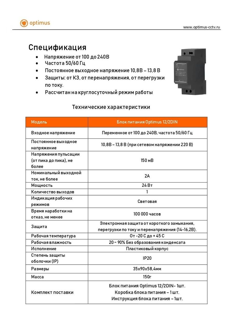 Блок питания Optimus 12/2DIN предназначен для обеспечения стабильным электропитанием устройств видеонаблюдения, домофонии и другого низковольтного оборудования. Выходное напряжение - 10,8В – 13,8 В (при сетевом напряжении 220 В), номинальный ток нагрузки — до 2 А.