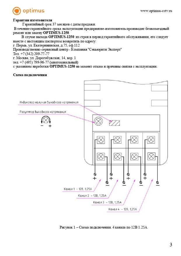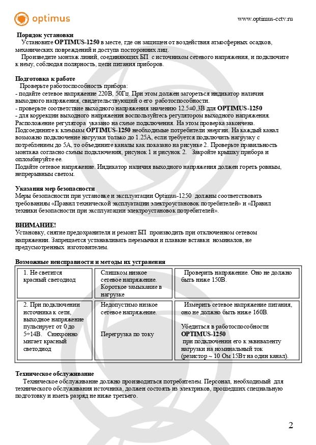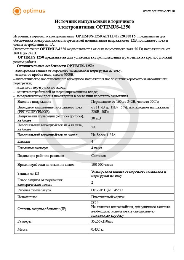 OPTIMUS-1250 предназначен для установки внутри помещения и рассчитан на круглосуточный режим работы. Поставляется в комплекте с кабелем.