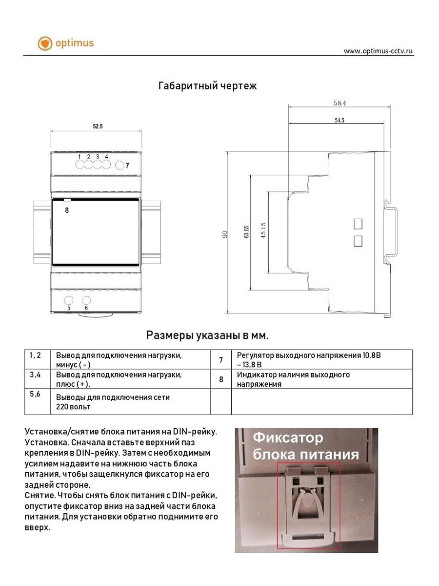 Блок питания Optimus 12/5DIN предназначен для обеспечения электропитанием устройств видеонаблюдения и другого низковольтного оборудования регулируемым напряжением от 10,8 В до 13,8 В постоянного тока с током потребления до 5 А. Блок питания оснащён встроенным регулятором выходного напряжения и предназначен для установки на DIN-рейку внутри помещения.