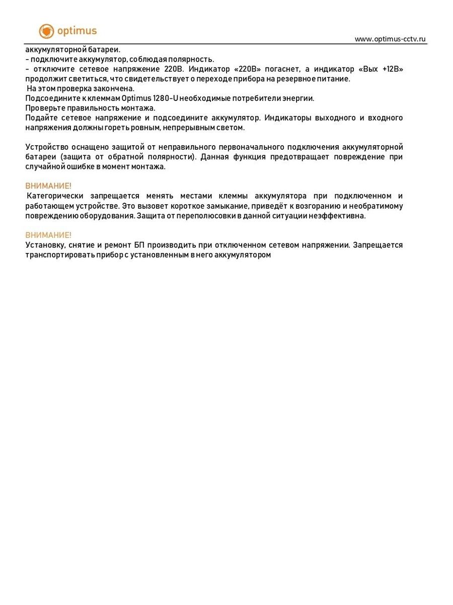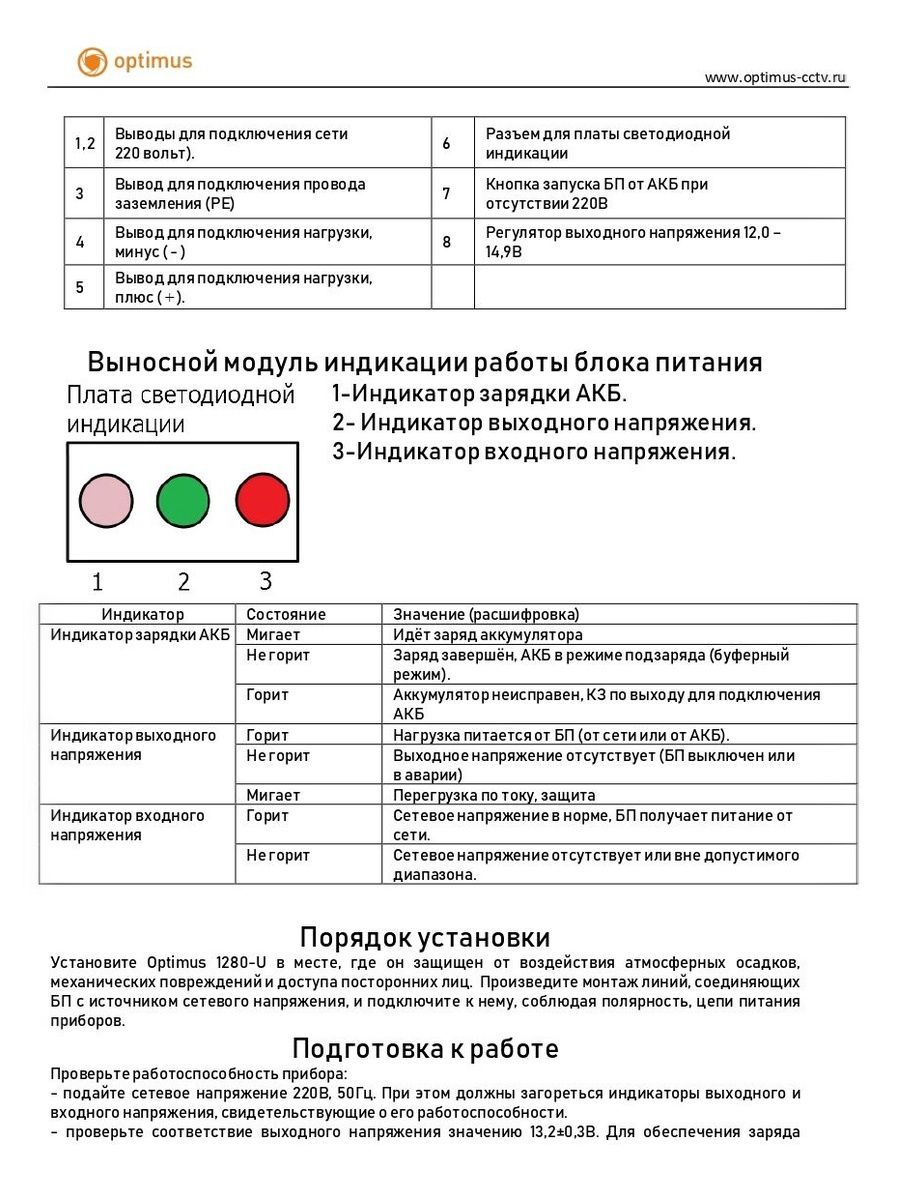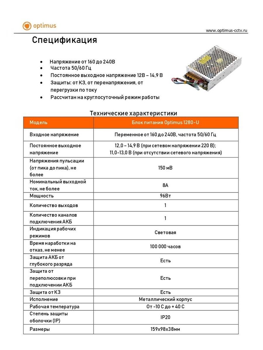 Блок питания Optimus 1280-U предназначен для бесперебойного электропитания устройств видеонаблюдения, систем контроля доступа и другого оборудования номинальным напряжением 12–14,9 В постоянного тока с током потребления до 8 А. Блок поддерживает подключение одной аккумуляторной батареи и автоматически переходит на резервное питание от АКБ при отключении сети 220 В.