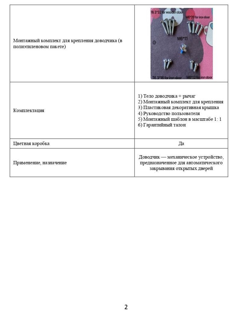 Монтажный комплект для крепления доводчика (в полиэтиленовом пакете) Центральный винт M6*11 - 1шт Саморезы T6.3*32 для деревянной двери - 4шт Винты M6*20 для железной двери - 4шт Саморезы T6.3*16 для железной двери - 2шт Винты M6*12 для железной двери - 2шт