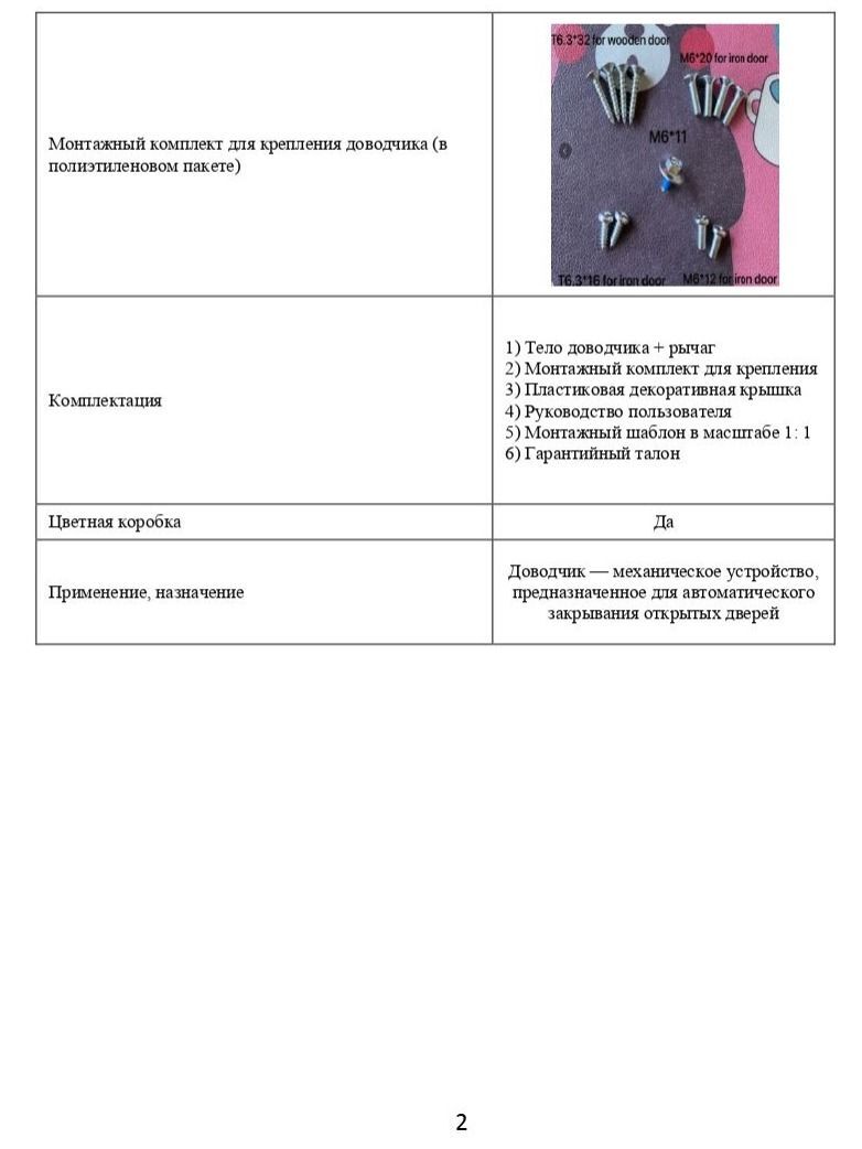 Монтажный комплект для крепления доводчика (в полиэтиленовом пакете) Центральный винт M6*11 - 1шт Саморезы T6.3*32 для деревянной двери - 4шт Винты M6*20 для железной двери - 4шт Саморезы T6.3*16 для железной двери - 2шт Винты M6*12 для железной двери - 2шт