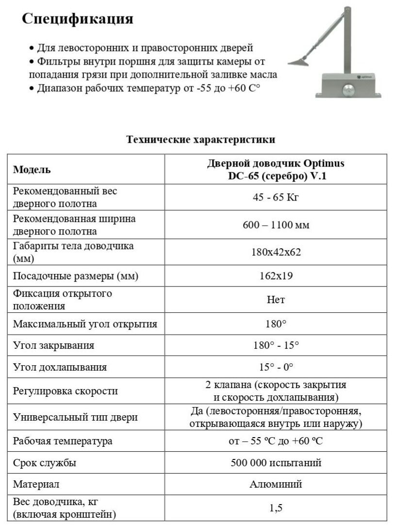 Доводчик дверной для двери весом 65 кг. Ширина дверного полотна не должна превышать 1100 мм. При необходимости доводчик можно устанавливать как на правые, так и на левые двери. Рабочая температура от -55°С до +60°С. Цвет: серебро.