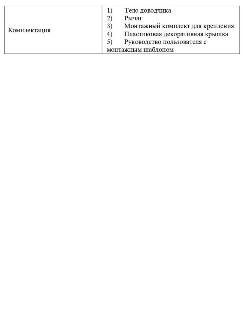 Комплектация 1) Тело доводчика 2) Рычаг 3) Монтажный комплект для крепления 4) Пластиковая декоративная крышка 5) Руководство пользователя с монтажным шаблоном