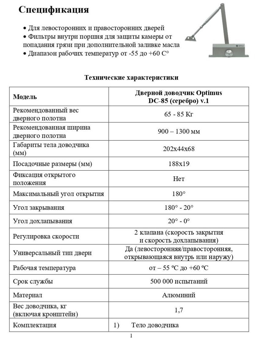 Доводчик дверной для двери весом 85 кг. Ширина дверного полотна не должна превышать 1300 мм. При необходимости доводчик можно устанавливать как на правые, так и на левые двери. Рабочая температура от -55°С до +60°С. Цвет: сереброт.