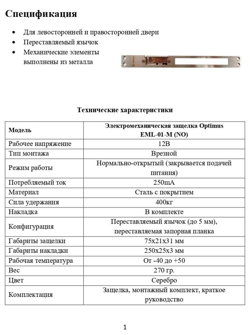 Нормально-открытые защелки Optimus EML-01-M (NO) предназначены для работы в системах контроля доступа с электронным управлением блокировкой дверей.