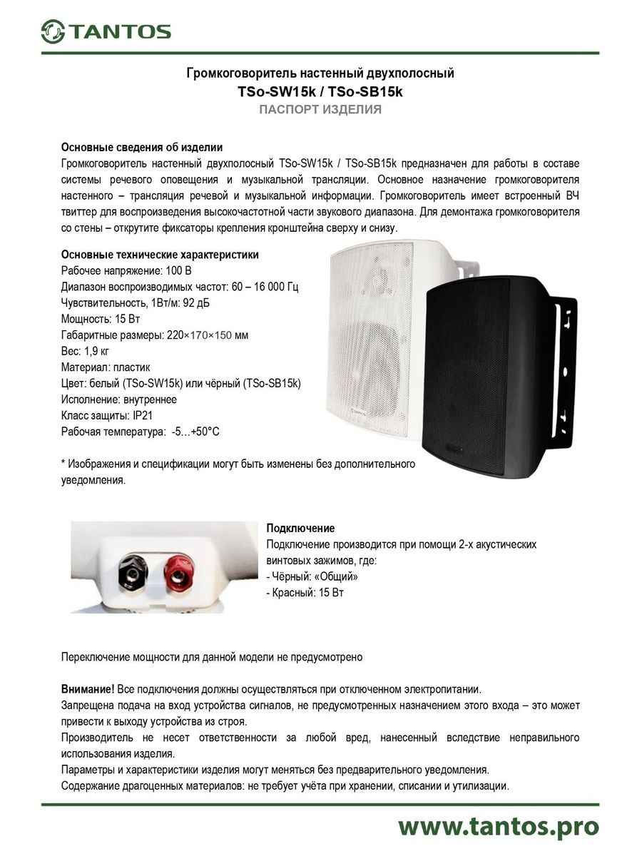 Громкоговоритель настенный двухполосный 15 Вт, 100В, 92дБ, 60-16000 Гц, чёрный, 220×170×150 мм