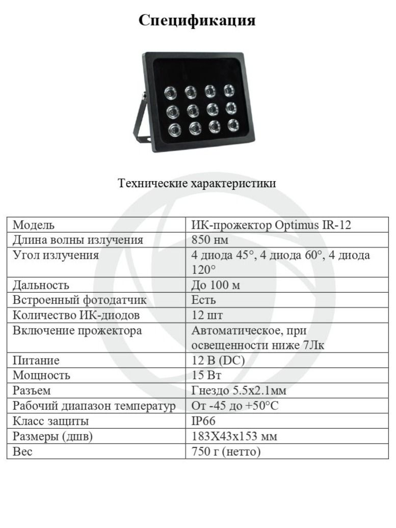ИК-прожектор Optimus IR-12 незаменим в устройстве круглосуточной системы видеонаблюдения уличного типа. 12 ИК-диодов обеспечивают подсветку в инфракрасном диапазоне дальностью до 100 м, позволяя освещать удаленные объекты, например на протяженных участках дороги. Длина волны излучения 850 нм, Угол излучения 4 диода 45°, 4 диода 60°, 4 диода 120°, Встроенный фотодатчик. Автоматическое включение прожектора при освещенности ниже 7 Лк.