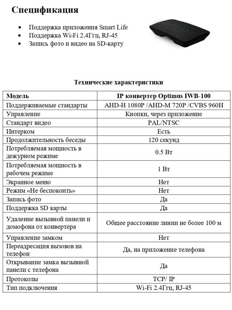 Optimus IWB-100 поддерживает 2 вызывные панели, 2 видеокамеры, 2 датчика, 1 видеодомофон. Оборудование подключается к сервису SmartLife(Tuya) и может просматриваться или управляться через приложение. Присутствует поддержка SD-карты объемом до 32Гб, что позволяет записывать вызов с вызывных панелей. Архив будет доступен через приложение SmartLife(Tuya). Подключение к точке доступа интернет осуществляется двумя способами: WI-FI 2.4ГГц и проводной, на случай отсутствия или слабого сигнала WI-FI Питание конвертера осуществляется от внешнего блока питания DC 12В, который входит в комплект поставки.