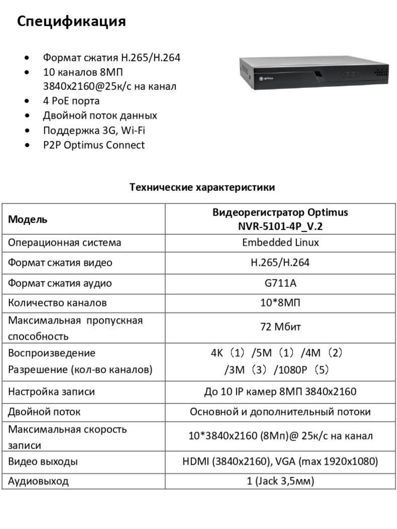 Сетевой видеорегистратор Optimus NVR-5101-4P_V.2 сочетает высокопроизводительный процессор обработки видеоданных и встроенную операционную систему Embedded Linux.