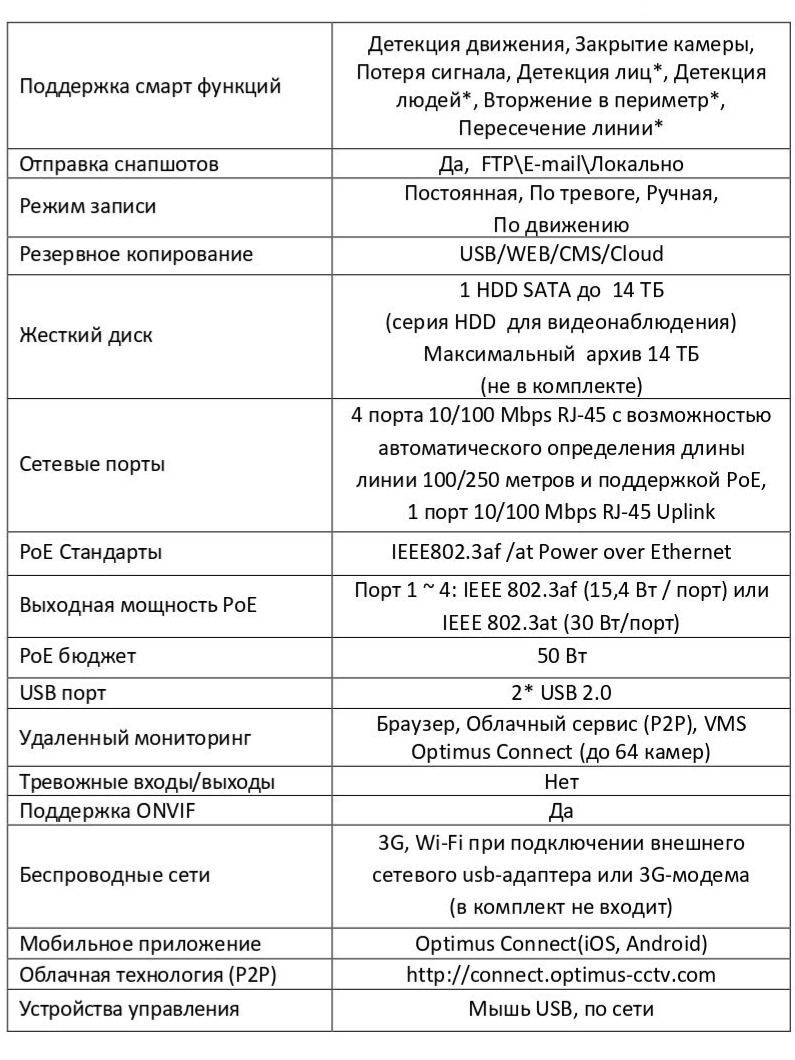 Поддержка смарт функций Детекция движения, Закрытие камеры, Потеря сигнала, Детекция лиц*, Детекция людей*, Вторжение в периметр*, Пересечение линии*.