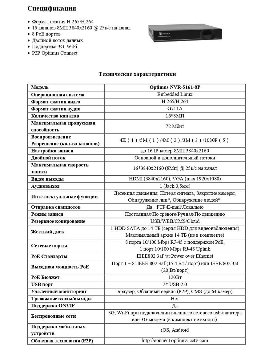 Сетевой видеорегистратор Optimus NVR-5161-8P сочетает высокопроизводительный процессор обработки видеоданных и встроенную операционную систему Embedded Linux.