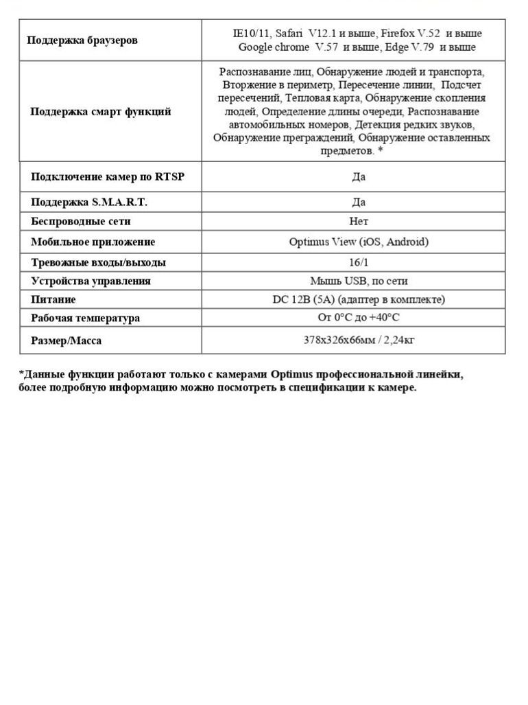 Расшифровка * *Данные функции работают только с камерами Optimus профессиональной линейки, более подробную информацию можно посмотреть в спецификации к камере.