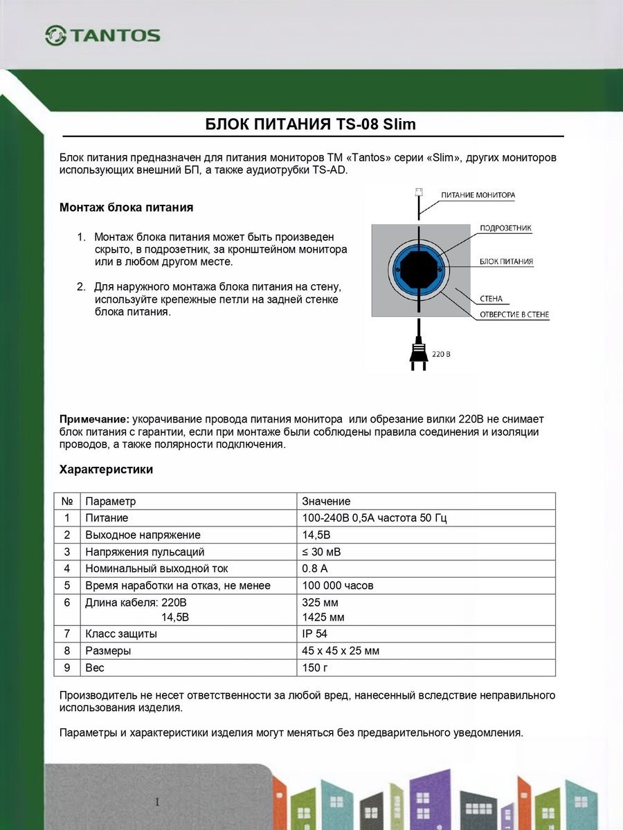 TS-08-Slim 2 Источник стабилизированного питания 14.5В, 0.8А. Совместим с мониторами серий Lea, Selina, Rocky, Marilyn и панелью Corban Wi-Fi