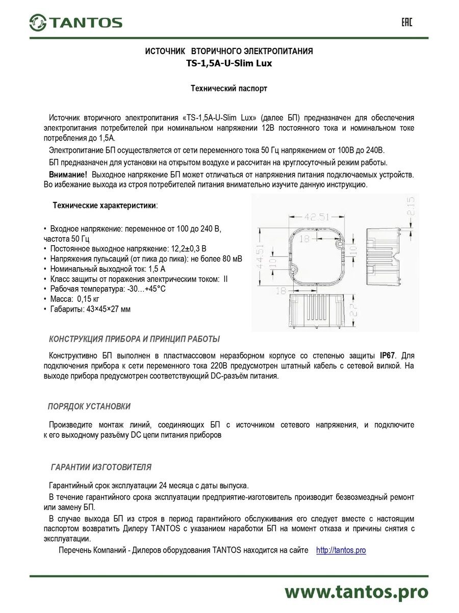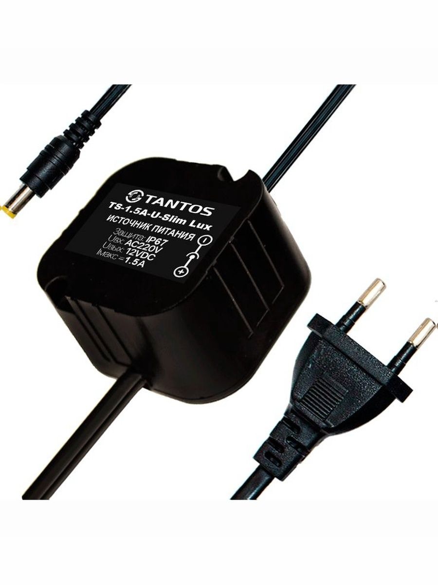 Источник вторичного электропитания 12В, 1.5А в корпусе IP67 (всепогодный). Выход: +12В/1.5А, разъём питания; вход: ~220В, сетевой шнур с вилкой в розетку. Длина кабеля: 40 см (от БП до разъема) + 40 см (от БП до вилки). 43×45×27 мм