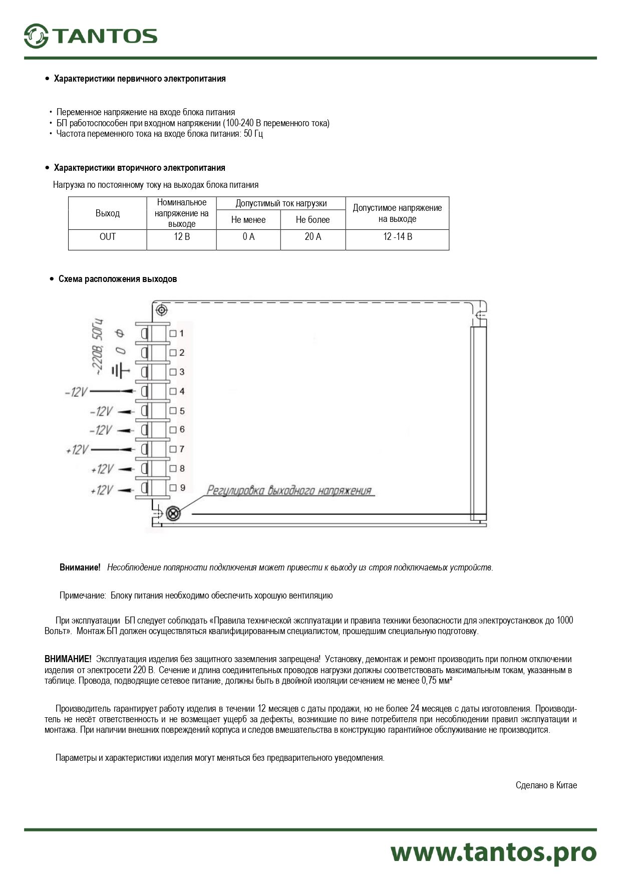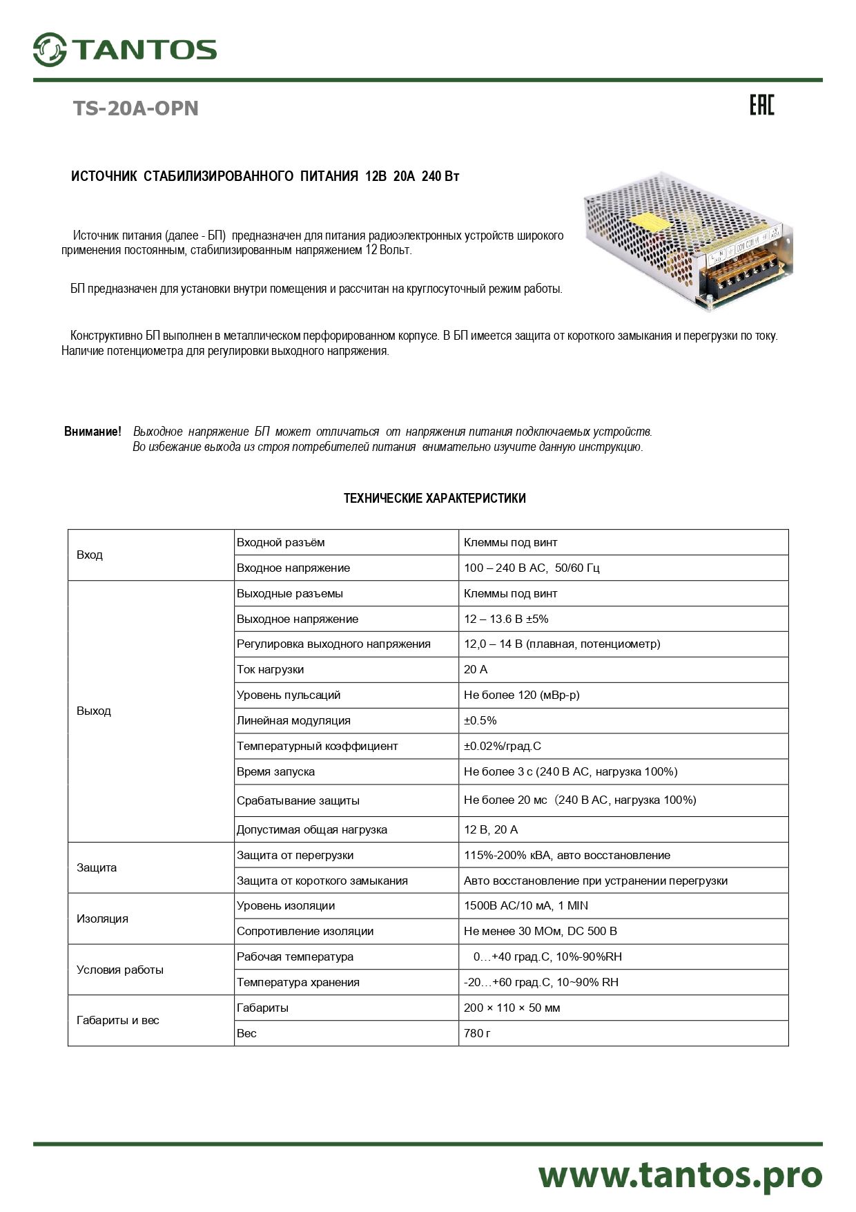 TS-20A-OPN Tantos Источник питания стабилизированный 12В 20А, регулировка выходного напряжения, защита от КЗ, перфорированный корпус IP20