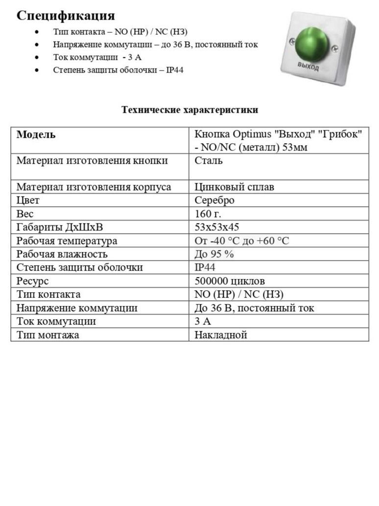 Кнопка Optimus "Выход" "Грибок" - NO/NC (металл) 53мм