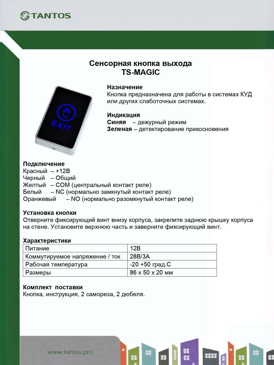 Сенсорная кнопка выхода. Предназначена для накладного монтажа. Выполнена в современном элегантном корпусе с габаритными размерами 86х50х20 мм. Цвет лицевой панели - белый