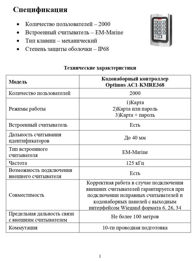 Кодонаборный контроллер Optimus AC1-KMRE368 предназначен для разграничения доступа на улице или в помещении при помощи бесконтактных идентификаторов или пароля. Дальность считывания меток до 40 мм. Тип метки - EM-Marine, Индикация, Зуммер, Протокол связи с контроллером Wiegand 26-34, питание 12-24В. Поддерживает 2000 пользователей. Исполнен в металлическом корпусе со степенью защиты IP68. Рабочая температура: -45°С ~ +60°С