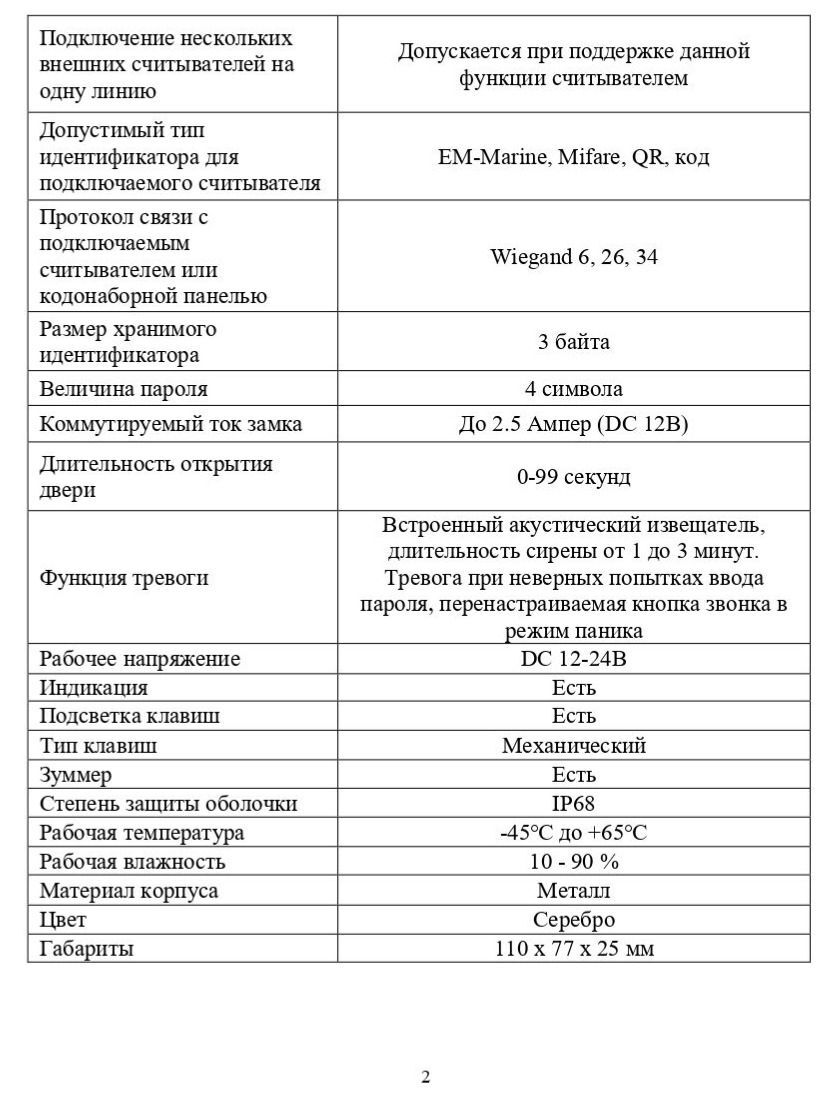 Совместимость Корректная работа в случае подключения внешних считывателей гарантируется при подключении исправных считывателей и кодонаборных панелей с выходным интерфейсом Wiegand формата 6, 26, 34