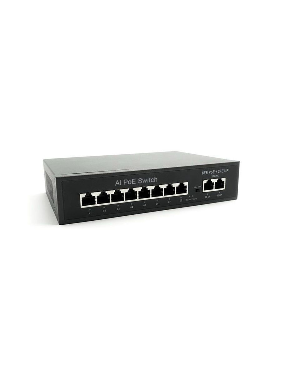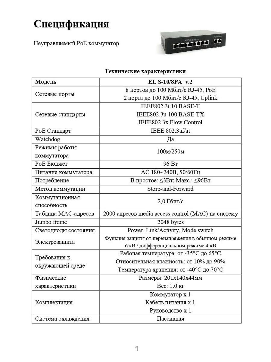 Коммутатор EL S-10/8PA_v.2 - неуправляемый PoE-коммутатор. Коммутатор оснащен портами 10/100 Мбит/с с поддержкой PoE (технология передачи питания по сетевому кабелю вместе с данными) к каждому из которых можно подключать сетевые устройства (IP-камеры, IP-телефоны, беспроводные точки доступа), и функцией Watchdog, позволяющей перезагрузить "зависшее" устройство, подключенное к коммутатору, путем снятия и повторной подачи напряжения. Poe-порты соответствуют стандартам PoE IEEE802.3af/at Power over Ethernet. Каждый порт подает питание мощностью до 52 Вт на сетевое оборудование. Это позволяет размещать оборудование в труднодоступных местах вне зависимости от расположения электрических розеток и минимизировать прокладку кабеля. Максимальная дальность подключения оборудования составляет 250 метров. Предусмотрено 2 порта 10/100 Мбит/с для подключения коммутатора к локальной сети, сети интернет, видеорегистратору или другому коммутатору. Поддерживает автоматическое определение MDI/MDIX на всех портах. Коммутатор распознает тип подключенного сетевого устройства и при необходимости меняет контакты передачи данных, что позволяет использовать кабели, обжатые любым способом (кроссовые и прямые). Имеет 2 режима работы 250 м и 100 м.