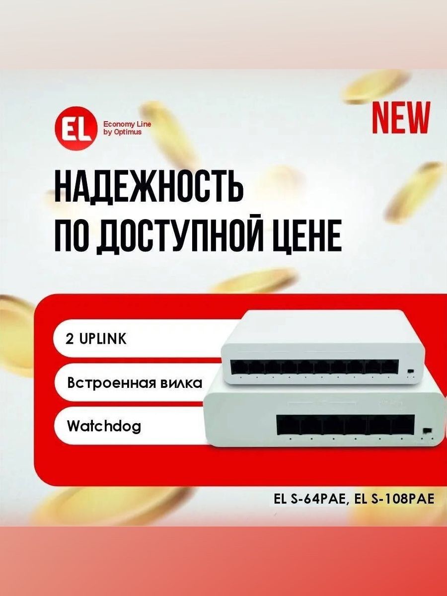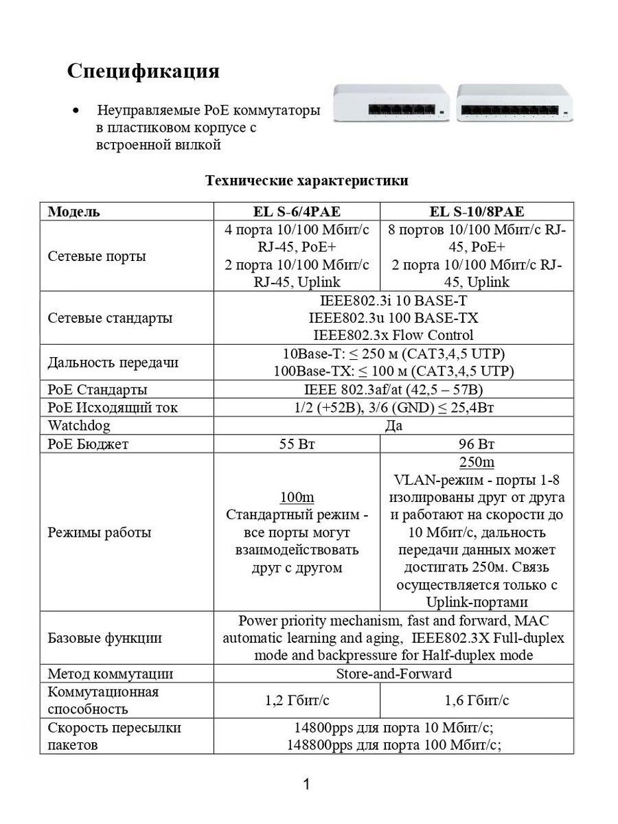 Коммутатор EL S-10/8PAE - это неуправляемый PoE-коммутатор в пластиковом корпусе и со встроенной вилкой питания. Он оснащен портами 10/100 Мбит/с с поддержкой PoE (технология передачи питания по сетевому кабелю вместе с данными), к каждому из которых можно подключать сетевые устройства (IP-камеры, IP-телефоны, беспроводные точки доступа).