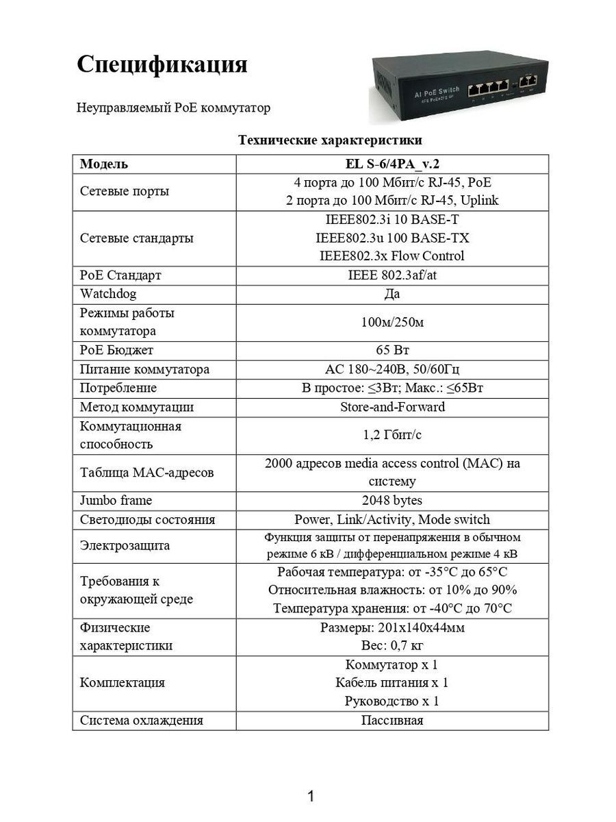 Коммутатор EL S-6/4PA_V.2- неуправляемый PoE-коммутатор. Коммутатор оснащен портами 10/100 Мбит/с с поддержкой PoE (технология передачи питания по сетевому кабелю вместе с данными) к каждому из которых можно подключать сетевые устройства (IP-камеры, IP-телефоны, беспроводные точки доступа), и функцией Watchdog, позволяющей перезагрузить "зависшее" устройство, подключенное к коммутатору, путем снятия и повторной подачи напряжения. Poe-порты соответствуют стандартам PoE IEEE802.3af/at Power over Ethernet. Каждый порт подает питание мощностью до 52 Вт на сетевое оборудование. Это позволяет размещать оборудование в труднодоступных местах вне зависимости от расположения электрических розеток и минимизировать прокладку кабеля. Максимальная дальность подключения оборудования составляет 250 метров. Предусмотрено 2 порта 10/100 Мбит/с для подключения коммутатора к локальной сети, сети интернет, видеорегистратору или другому коммутатору. Поддерживает автоматическое определение MDI/MDIX на всех портах. Коммутатор распознает тип подключенного сетевого устройства и при необходимости меняет контакты передачи данных, что позволяет использовать кабели, обжатые любым способом (кроссовые и прямые). Имеет 2 режима работы 250 м и 100 м.