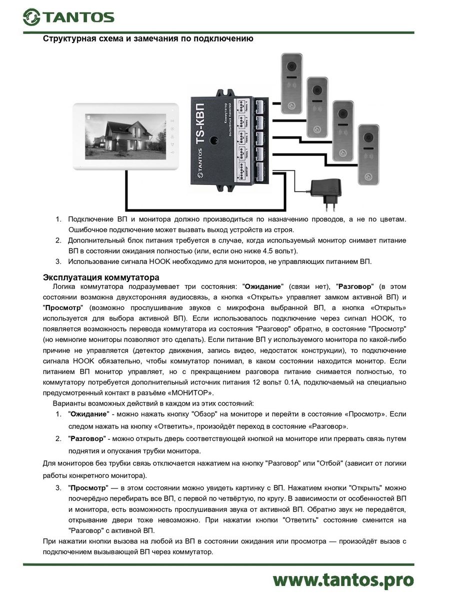 Коммутатор аналоговых вызывных панелей предназначен для подключения до четырёх стандартных аналоговых панелей к одному порту монитора индивидуального видеодомофона, для приема вызовов от любой из панелей, обеспечения двухсторонней аудиосвязи и разблокировки замка двери активной панели с помощью стандартных функций монитора. В большинстве случаев (при соответствии монитора нижеприведённым требованиям), возможно «листание» (поочерёдное переключение) панелей в режиме просмотра для целей дежурного наблюдения.