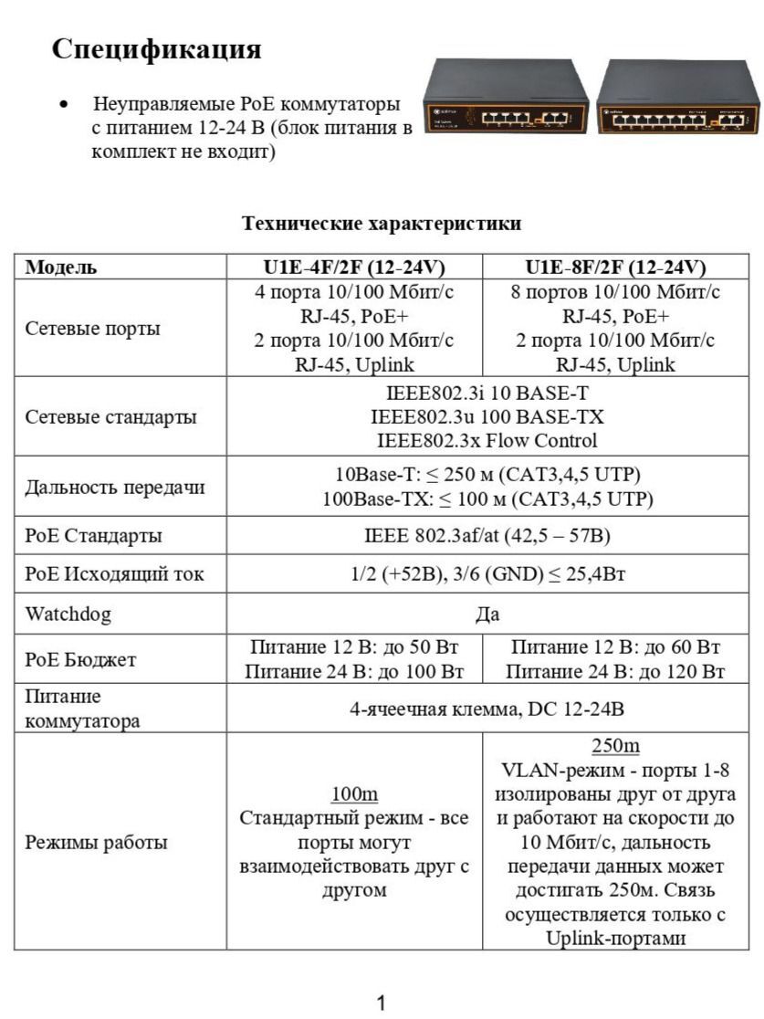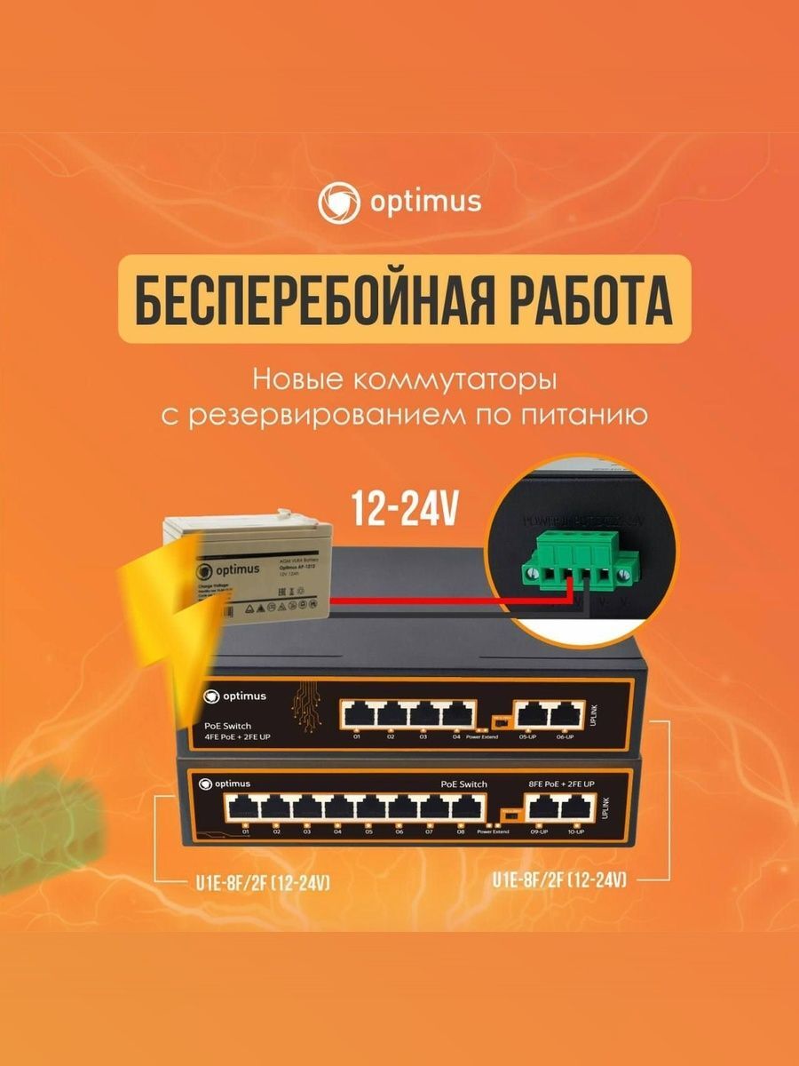 Коммутатор Optimus U1E-4F/2F (12-24V) - это неуправляемый PoE-коммутатор с питанием 12-24 В. Он оснащен портами 10/100 Мбит/с с поддержкой PoE (технология передачи питания по сетевому кабелю вместе с данными), к каждому из которых можно подключать сетевые устройства (IP-камеры, IP-телефоны, беспроводные точки доступа).