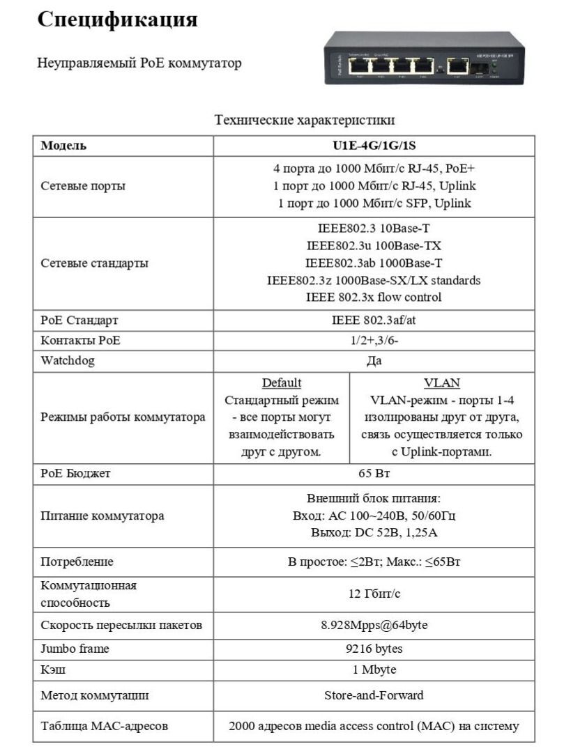 Предусмотрены 2 Uplink-порта: RJ-45 и SPF со скоростью передачи данных до 1000 Мбит/с для подключения коммутатора к локальной сети, сети интернет, видеорегистратору или другому коммутатору.