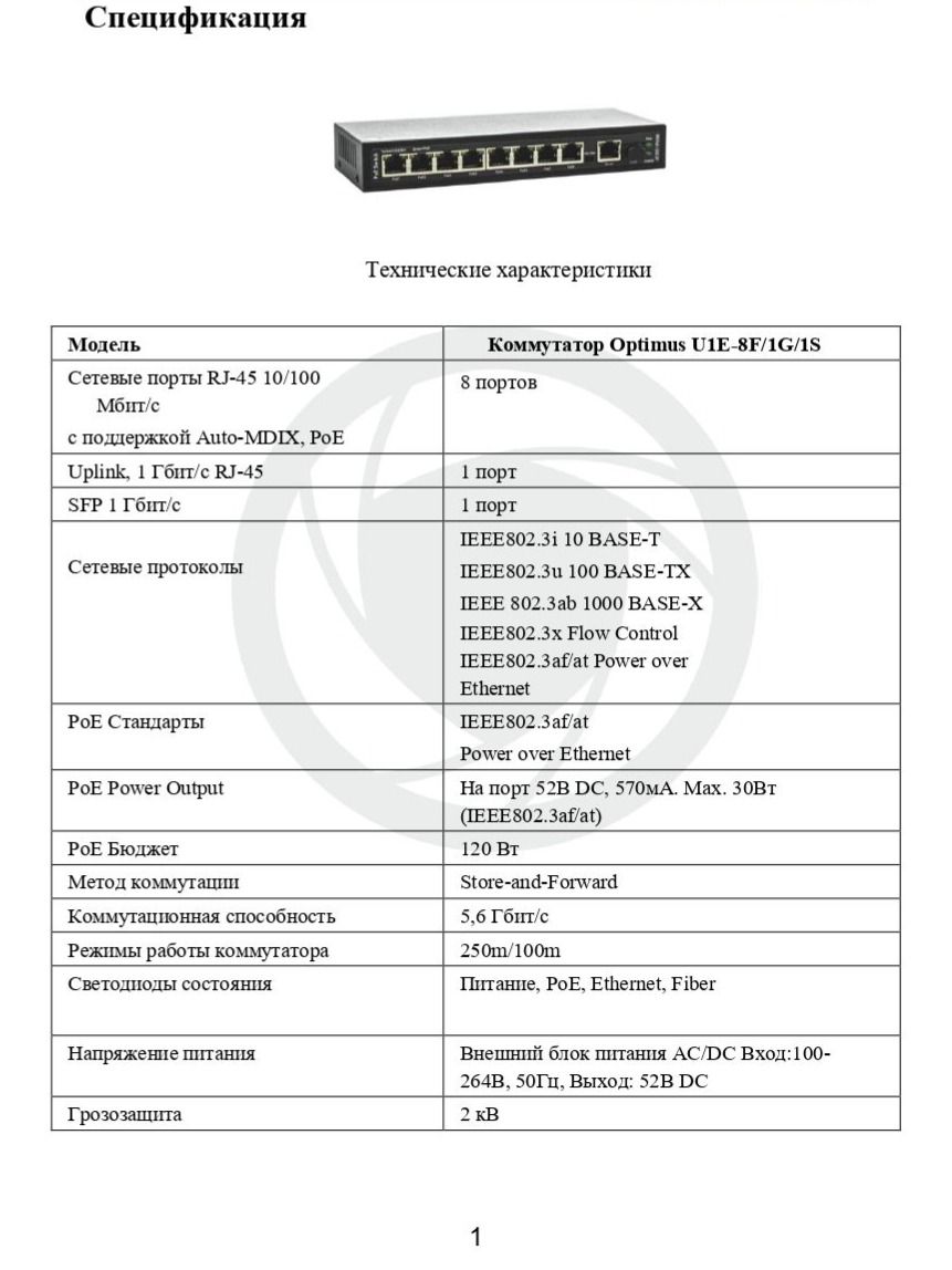Optimus U1E-8F/1G/1S - неуправляемый PoE-коммутатор с внешним блоком питания. Коммутатор оснащен портами 10/100 Мбит/с с поддержкой PoE (технология передачи питания по сетевому кабелю вместе с данными) к каждому из которых можно подключать сетевые устройства (IP-камеры, IP-телефоны, беспроводные точки доступа).