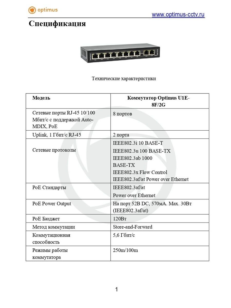 Optimus U1E-8F/2G - неуправляемый PoE-коммутатор с внешним блоком питания. Коммутатор оснащен портами 10/100 Мбит/с с поддержкой PoE (технология передачи питания по сетевому кабелю вместе с данными) к каждому из которых можно подключать сетевые устройства (IP-камеры, IP-телефоны, беспроводные точки доступа).
