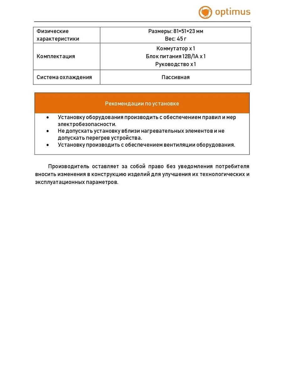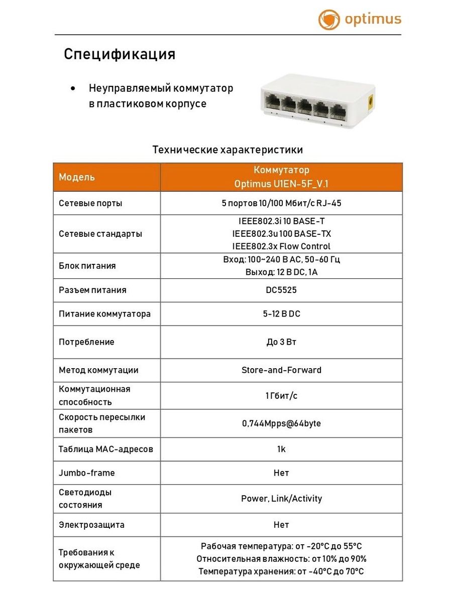 Optimus U1EN-5F_V.1 — это неуправляемый коммутатор без функции питания PoE. Он оснащен 5 портами 10/100 Мбит/с, к каждому из которых можно подключать сетевые устройства (IP-камеры, IP-телефоны, беспроводные точки доступа). Коммутационная способность составляет 1 Гбит/с, таблица MAC-адресов — 1K. Блок питания имеет выходное напряжение 12 вольт / 1А (в комплекте). Разъем питания DC5525. Компактный пластиковый корпус, пассивное охлаждение, потребление до 3 Вт. Рабочая температура от –20°C до +55°C. Размеры: 81×51×23 мм, вес 45 г.