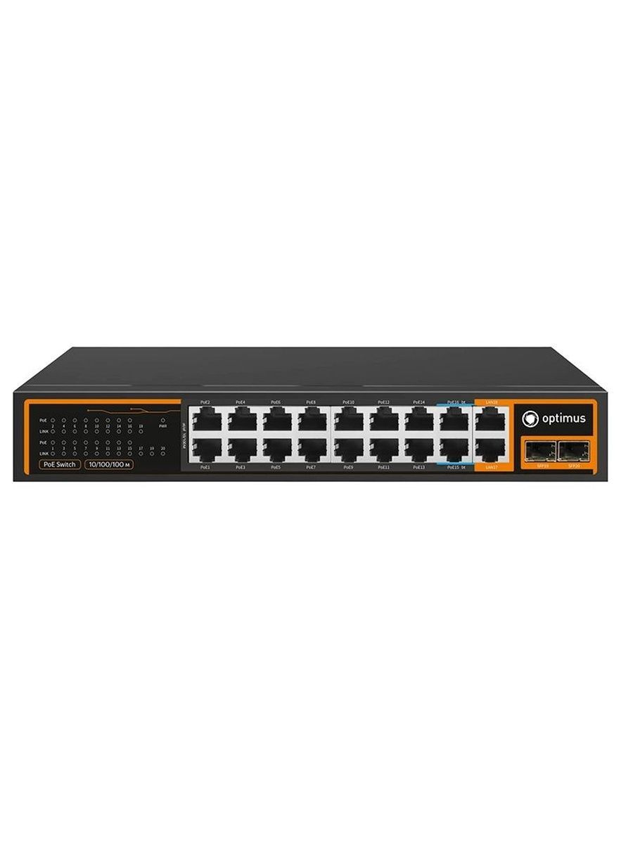 Коммутатор Optimus U1I-16F2b/2G/2S - неуправляемый PoE-коммутатор. Коммутатор оснащен портами 10/100 Мбит/с с поддержкой PoE (технология передачи питания по сетевому кабелю вместе с данными) к каждому из которых можно подключать сетевые устройства (IP-камеры, IP-телефоны, беспроводные точки доступа), а также с функцией Watchdog, она позволяет перезагрузить "зависшее" устройство, подключенное к коммутатору, путем снятия и повторной подачи напряжения.