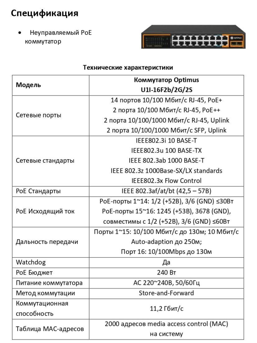 PoE-порты соответствуют стандартам PoE IEEE802.3af/at. а последний порт у коммутатора Optimus U1I-16F2b/2G/2S соответствует стандартам IEEE802.3af/at/bt. Каждый порт подает питание мощностью до 30 Вт (в bt стандарте до 60 Вт) на сетевое оборудование. Это позволяет размещать оборудование в труднодоступных местах вне зависимости от расположения электрических розеток и минимизировать прокладку кабеля. Максимальная дальность подключения оборудования составляет 130 метров. Коммутатор имеет режим Auto-adaption на портах 1-15. Коммутатор автоматически определяет длину линии и переключает нужный порт в режим 10 Мбит/с, 250м.