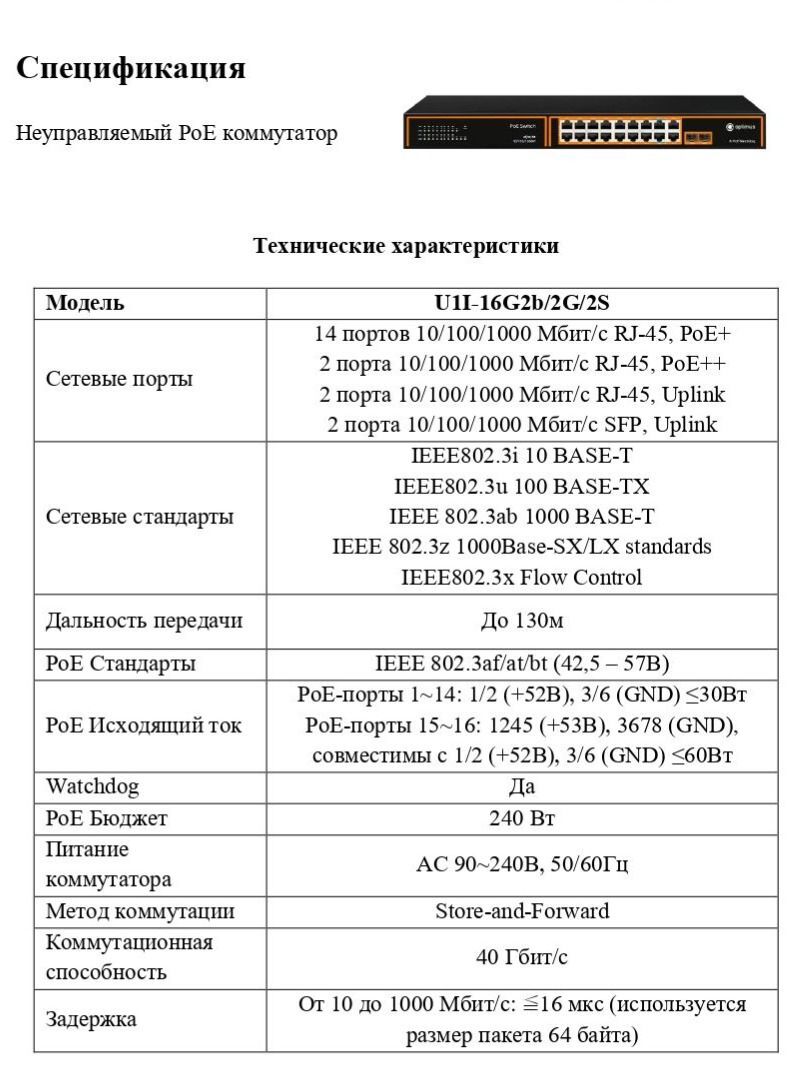 Коммутатор Optimus U1I-16G2b/2G/2S - неуправляемый PoE-коммутатор. Он оснащен 16 портами 10/100/1000 Мбит/с с поддержкой PoE (технология передачи питания по сетевому кабелю вместе с данными) к каждому из которых можно подключать сетевые устройства (IP-камеры, IP-телефоны, беспроводные точки доступа).