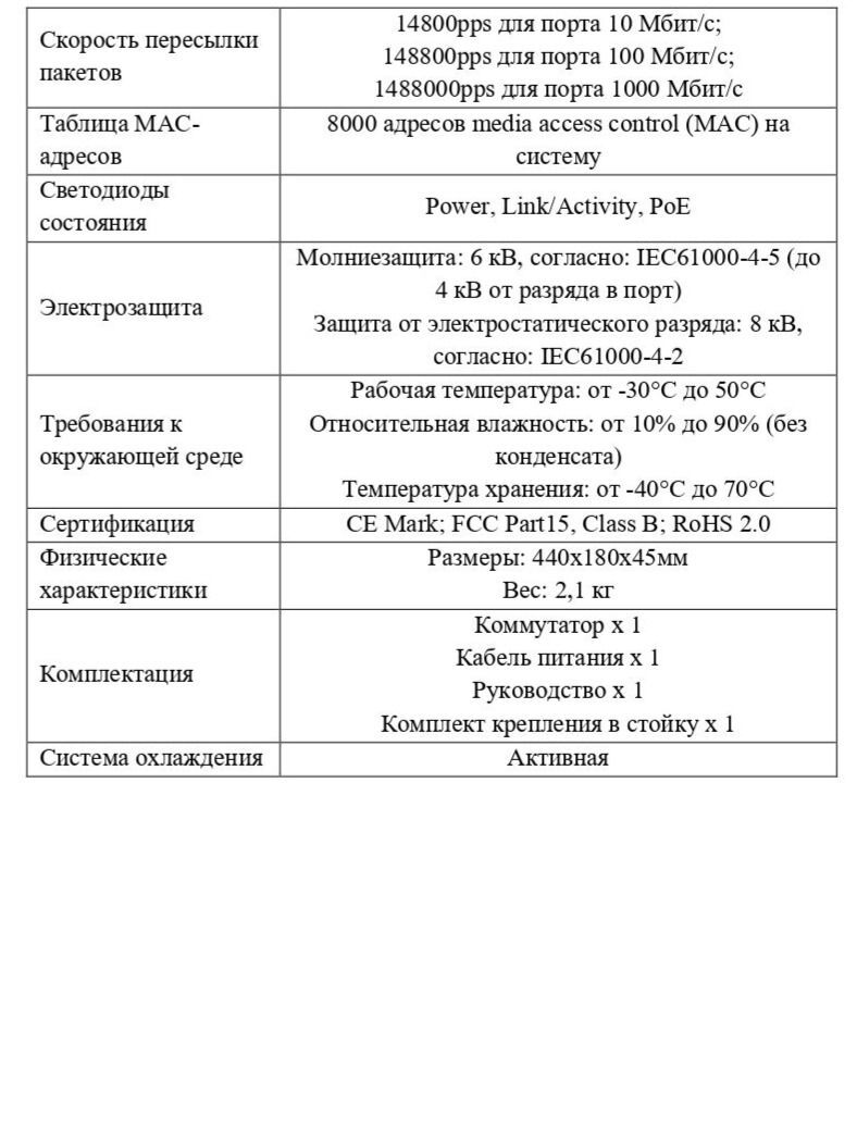 Комплект поставки Коммутатор, кабель питания, руководство, комплект крепления в стойку