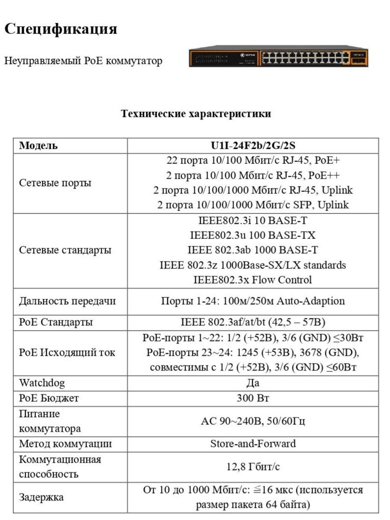 PoE Исходящий ток PoE-порты 1~22: 1/2 (+52В), 3/6 (GND) ≤30Вт; PoE-порты 23~24: 1245 (+53В), 3678 (GND), совместимы с 1/2 (+52В), 3/6 (GND) ≤60Вт