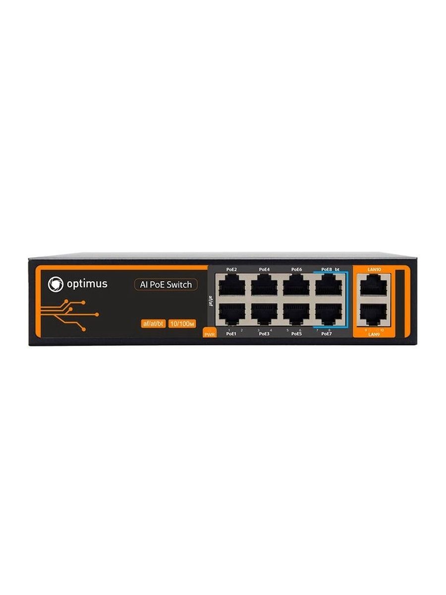 Коммутатор Optimus U1I-8F2b/2F - неуправляемый PoE-коммутатор. Коммутатор оснащен портами 10/100 Мбит/с с поддержкой PoE (технология передачи питания по сетевому кабелю вместе с данными) к каждому из которых можно подключать сетевые устройства (IP-камеры, IP-телефоны, беспроводные точки доступа), а также с функцией Watchdog, она позволяет перезагрузить "зависшее" устройство, подключенное к коммутатору, путем снятия и повторной подачи напряжения.
