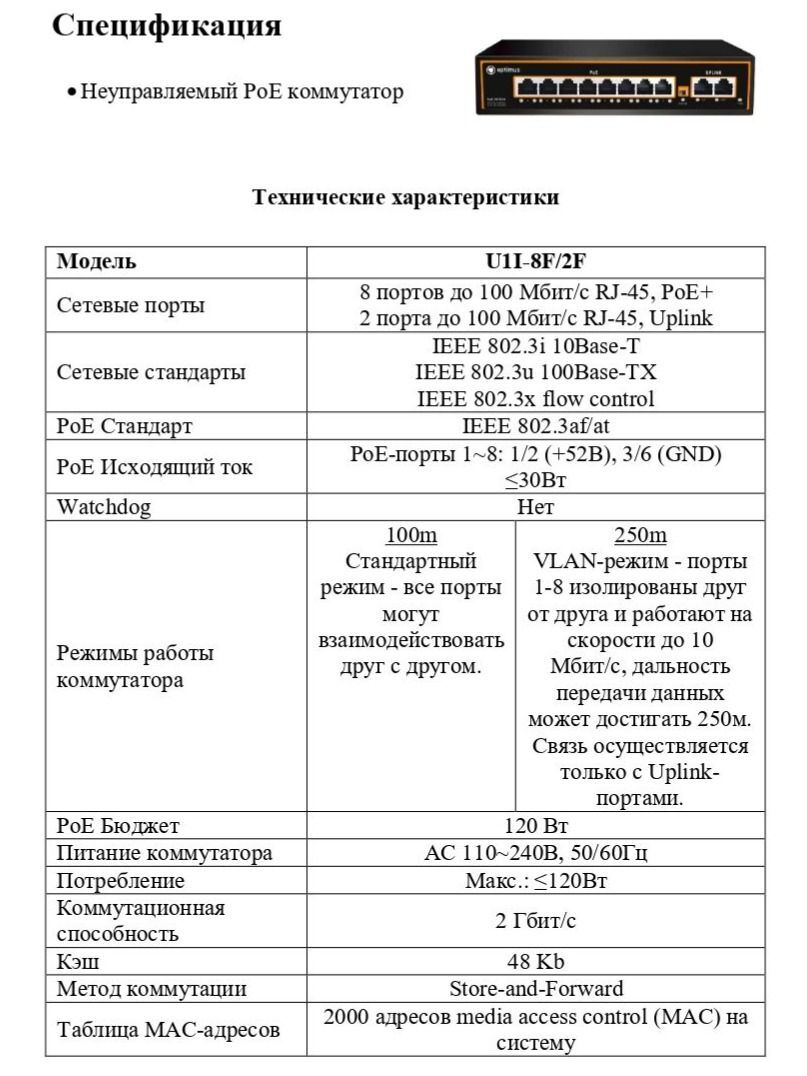 Коммутатор Optimus U1I-8F/2F - неуправляемый PoE-коммутатор. Он оснащен 8 портами 10/100 Мбит/с с поддержкой PoE (технология передачи питания по сетевому кабелю вместе с данными) к каждому из которых можно подключать сетевые устройства (IP-камеры, IP-телефоны, беспроводные точки доступа).