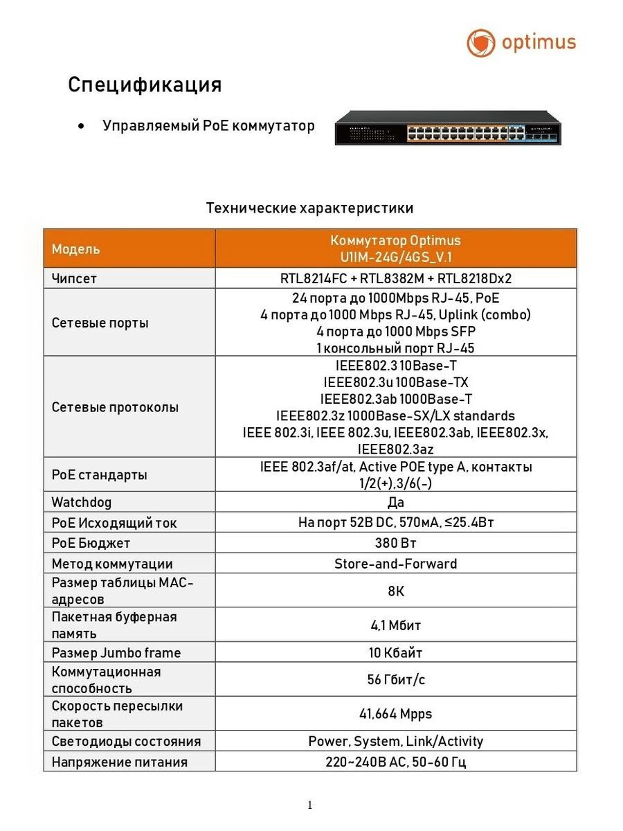 Коммутатор Optimus U1IM-24G/4GS_V.1 – 24 - портовый управляемый PoE-коммутатор. Все порты коммутатора работают в 10/100/1000 Мбит/с с поддержкой PoE (технология передачи питания по сетевому кабелю вместе с данными), к каждому из которых можно подключать сетевые устройства (IP-камеры, IP-телефоны, беспроводные точки доступа).