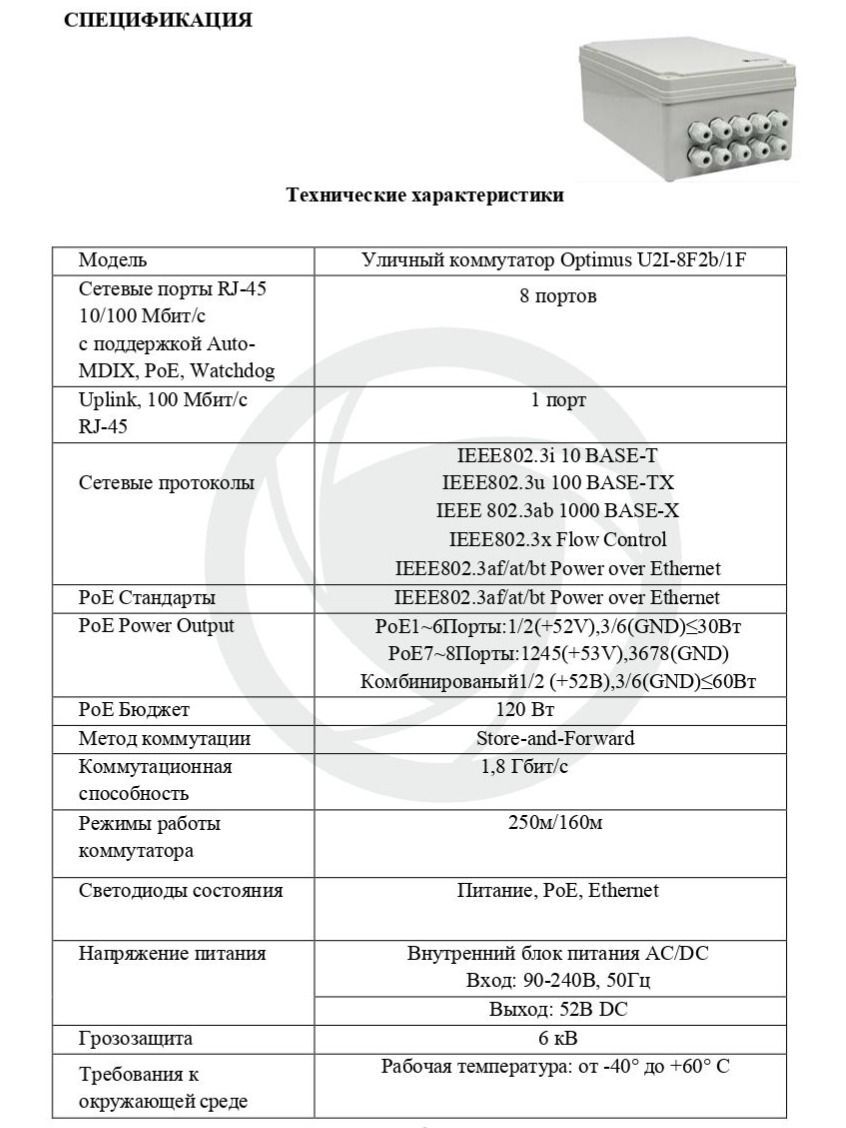 Коммутатор Optimus U2I-8F2b/1F - неуправляемый уличный PoE коммутатор. Герметичный пластиковый корпус с классом защиты IP66 не подвержен коррозии. Способен выдерживать большие перепады температур. Расширенный температурный диапазон позволяет использовать коммутатор в теплонагруженных производственных помещений, в северных районах с низкими температурами, а также на объектах с повышенной влажностью. Корпус устойчив к ультрафиолетовому излучению. Предусмотрена улучшенная система пассивного охлаждения.
