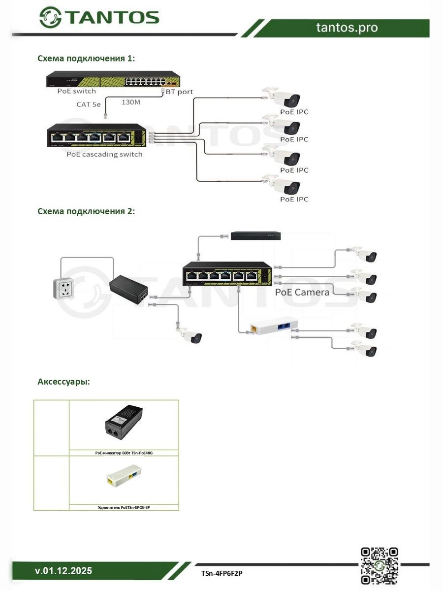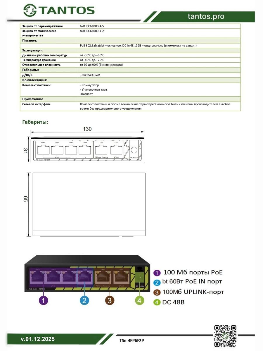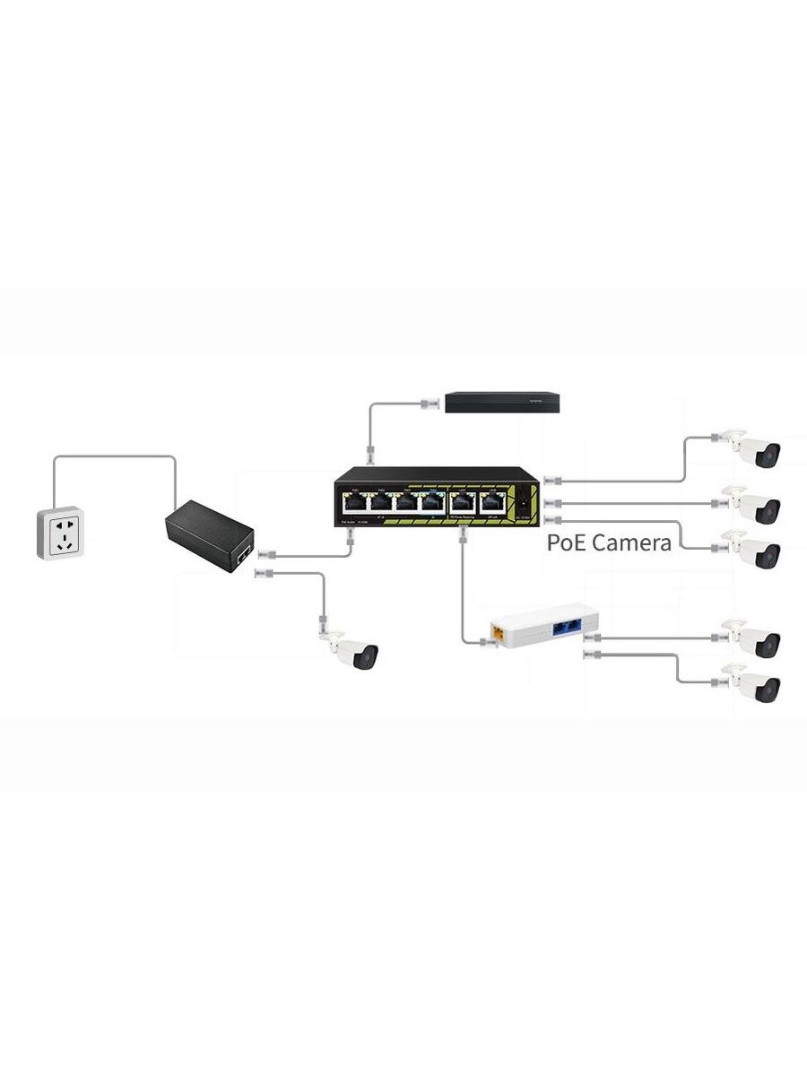 PoE коммутатор с питанием самого коммутатора по PoE (PoE in)4x100 Мбит/с PoE порта (3 порта 802.3af/at, максимальная мощность PoE 30Вт на порт, 1 порт 802.3af/at/bt, максимальная мощность PoE 60Вт на порт) + 2x100 Мбит/с порта Uplink, один из которых используется для питания самого коммутатора, общий бюджет PoE 60 Вт, автоматический PoE watchdog грозозащита и защита от статического электричества, каскадное подключение до 4-х устройств, от -30°С до +60°С. Блок питания в комплект поставки не входит, использование внешнего блока питания в большинстве случаев не требуется.