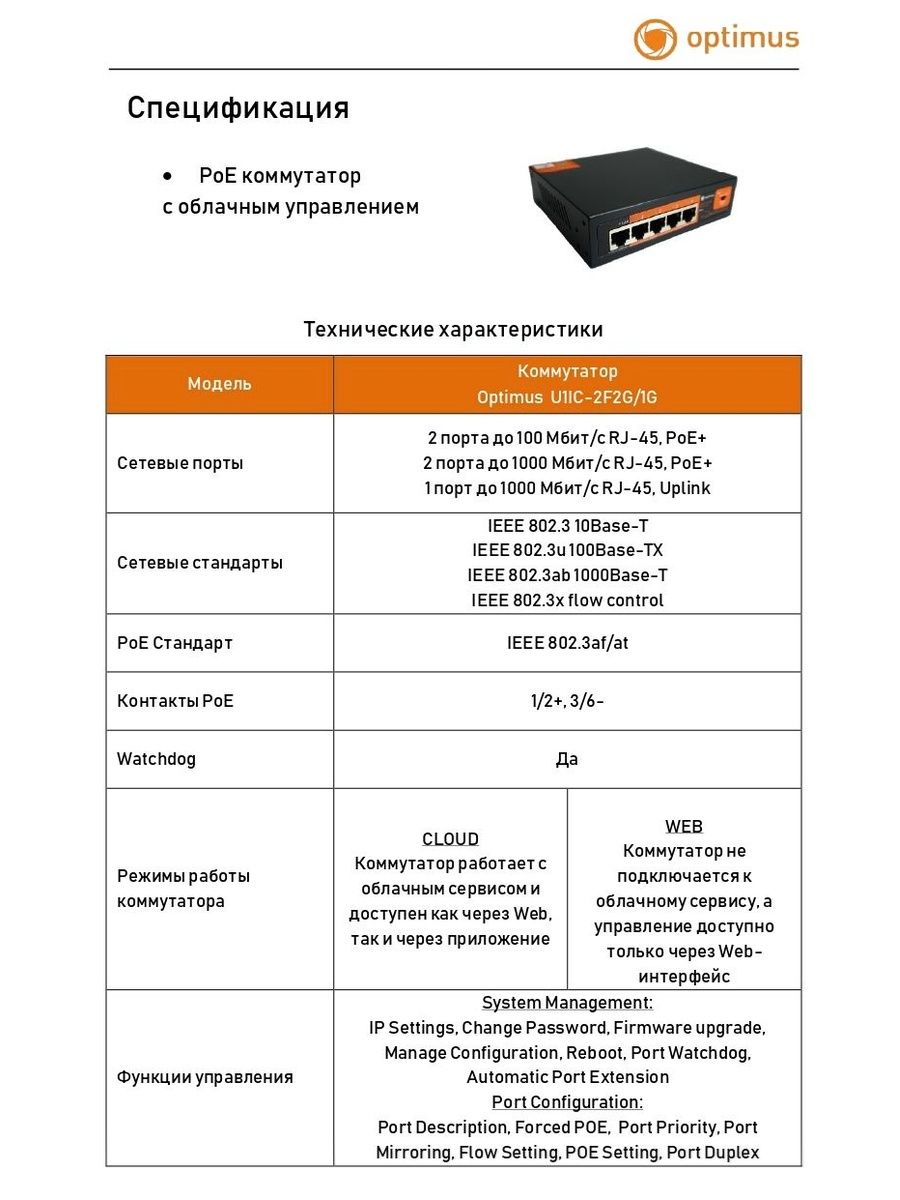 Коммутатор Optimus U1IC-2F/2G/1G — это компактный управляемый PoE-коммутатор с облачным управлением. 2 порта до 100 Мбит/с RJ-45, PoE+ 2 порта до 1000 Мбит/с RJ-45, PoE+ 1 порт до 1000 Мбит/с RJ-45, Uplink. Коммутационная способность составляет 6,4 Гбит/с, таблица MAC-адресов — 2K. Бюджет PoE — 52 Вт (стандарт IEEE 802.3af/at). Поддерживаются режимы CLOUD (управление через облако, веб и приложение) и WEB (локальное управление через веб-интерфейс). Пассивное охлаждение, рабочая температура от 0°C до +40°C. Компактные размеры, вес около 0,4 кг. В комплекте кабель питания.