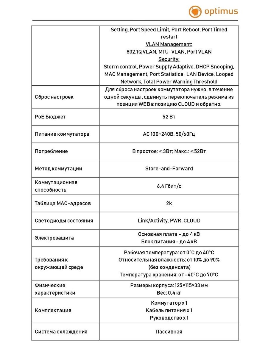 Функции управления System Management: IP Settings, Change Password, Firmware upgrade, Manage Configuration, Reboot, Port Watchdog, Automatic Port Extension Port Configuration: Port Description, Forced POE, Port Priority, Port Mirroring, Flow Setting, POE Setting, Port Duplex Setting, Port Speed Limit, Port Reboot, Port Timed restart VLAN Management: 802.1Q VLAN, MTU-VLAN, Port VLAN Security: Storm control, Power Supply Adaptive, DHCP Snooping, MAC Management, Port Statistics, LAN Device, Looped Network, Total Power Warning Threshold