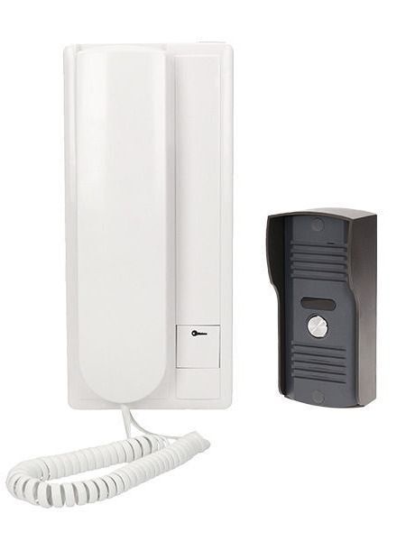 Комплектация База - 1шт., Трубка с проводом подключения к базе - 1шт., Вызывная панель - 1шт., Козырек-кронштейн для вызывной панели - 1шт., Кронштейн для базы – 1шт., Монтажный комплект (дюбель пластмассовый - 6шт., саморезы под дюбель - 8 шт.)