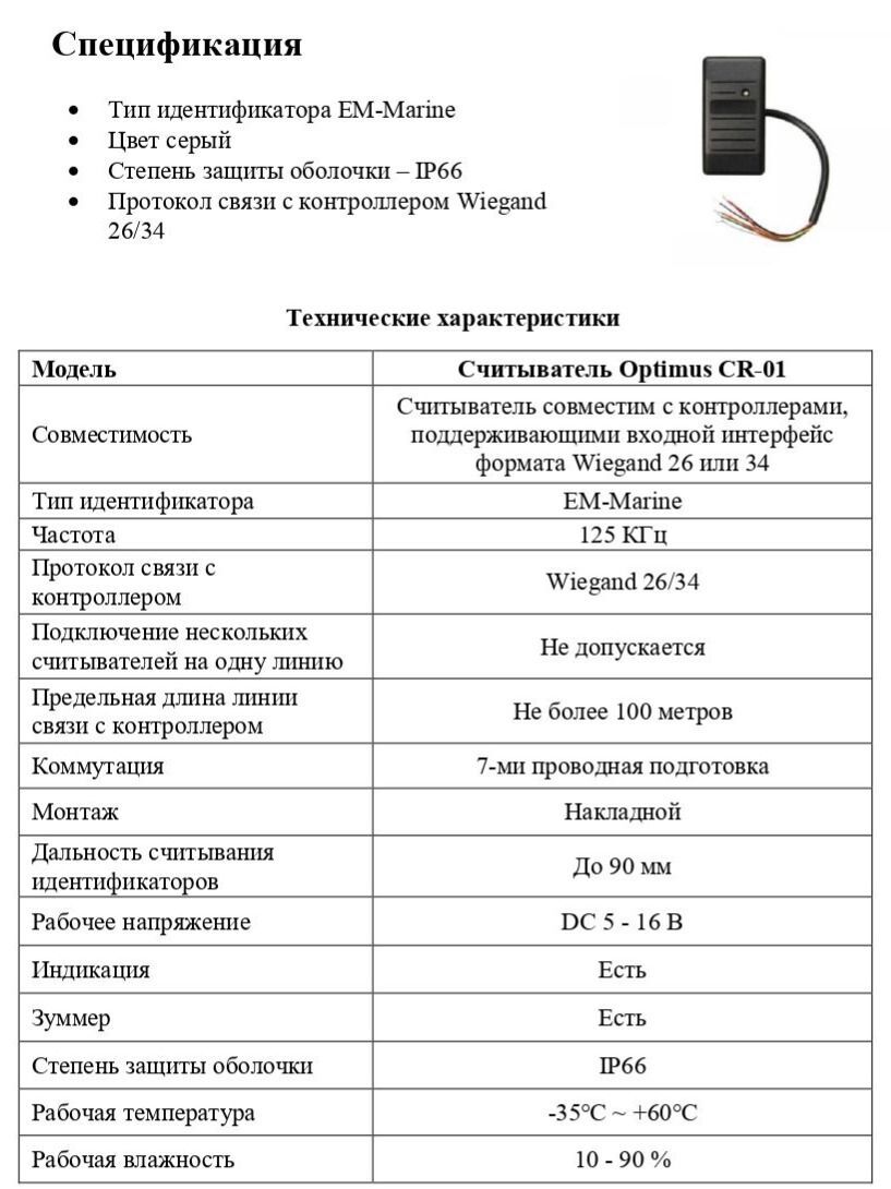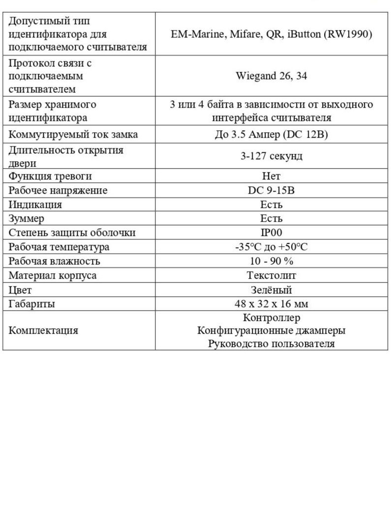 Совместимость Контроллер: корректная работа в случае подключения внешних считывателей гарантируется при подключении исправных считывателей выходным интерфейсом Wiegand формата 26, 34 или считывателей контакторов с выходным интерфейсом TM (iButton, ключи RW1990); Считыватель: совместим с контроллерами, поддерживающими входной интерфейс формата Wiegand 26 или 34