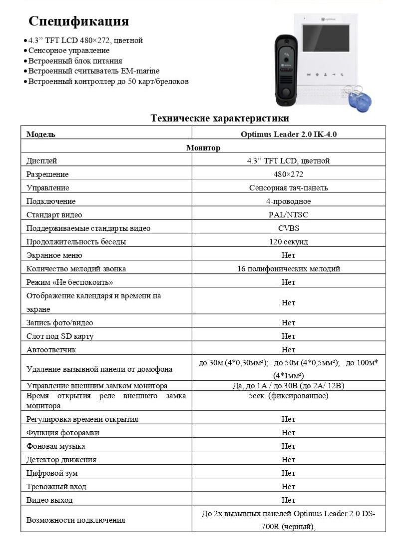 Цветной монитор оборудован 4.3” TFT LCD дисплеем, с разрешением 480х272 пикселей. Видеодомофон поддерживает стандарты видео PAL/NTSC. Видеодомофон оснащен коммутационным реле с режимами работы Н.О и Н.З. Продолжительность беспрерывной беседы достигает 2 минут. Вызывная панель при этом может располагаться от видеодомофона на расстоянии до 100м. К домофону возможно подключить 2 вызывные панели, 2 аналоговые камеры. С монитором совместимы 4-проводные вызывные видеопанели Optimus Leader 2.0. Устанавливается накладным способом при помощи пластины, которая идет в комплекте.
