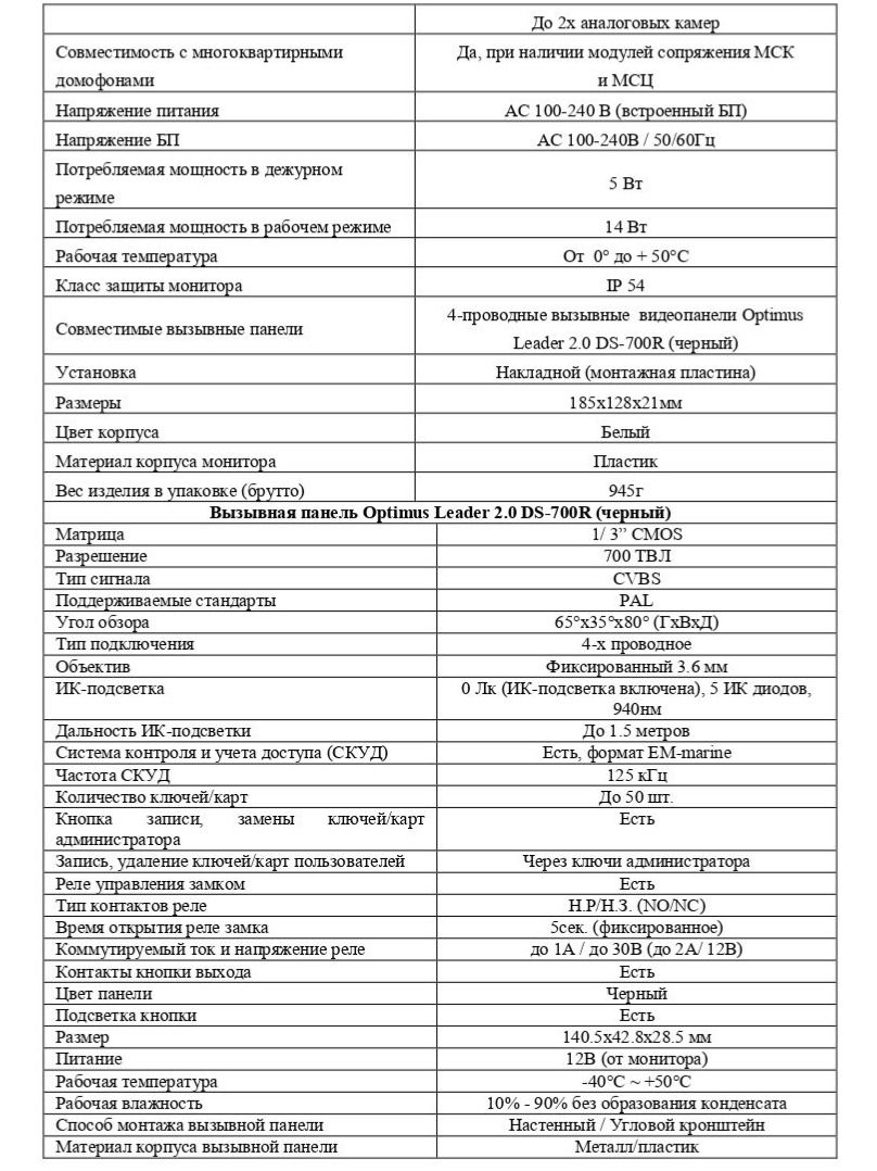 Возможности подключения До 2х вызывных панелей Optimus Leader 2.0 DS-700R (черный), До 2х аналоговых камер