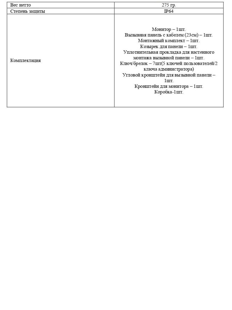 Комплектация Монитор – 1шт; Вызывная панель с кабелем (23см) – 1шт; Монтажный комплект – 1шт; Козырек для панели – 1шт; Уплотнительная прокладка для настенного монтажа вызывной панели – 1шт; Ключ/брелок – 7шт(5 ключей пользователей/2 ключа администратора); Угловой кронштейн для вызывной панели –1 шт; Кронштейн для монитора – 1шт; Коробка-1 шт.